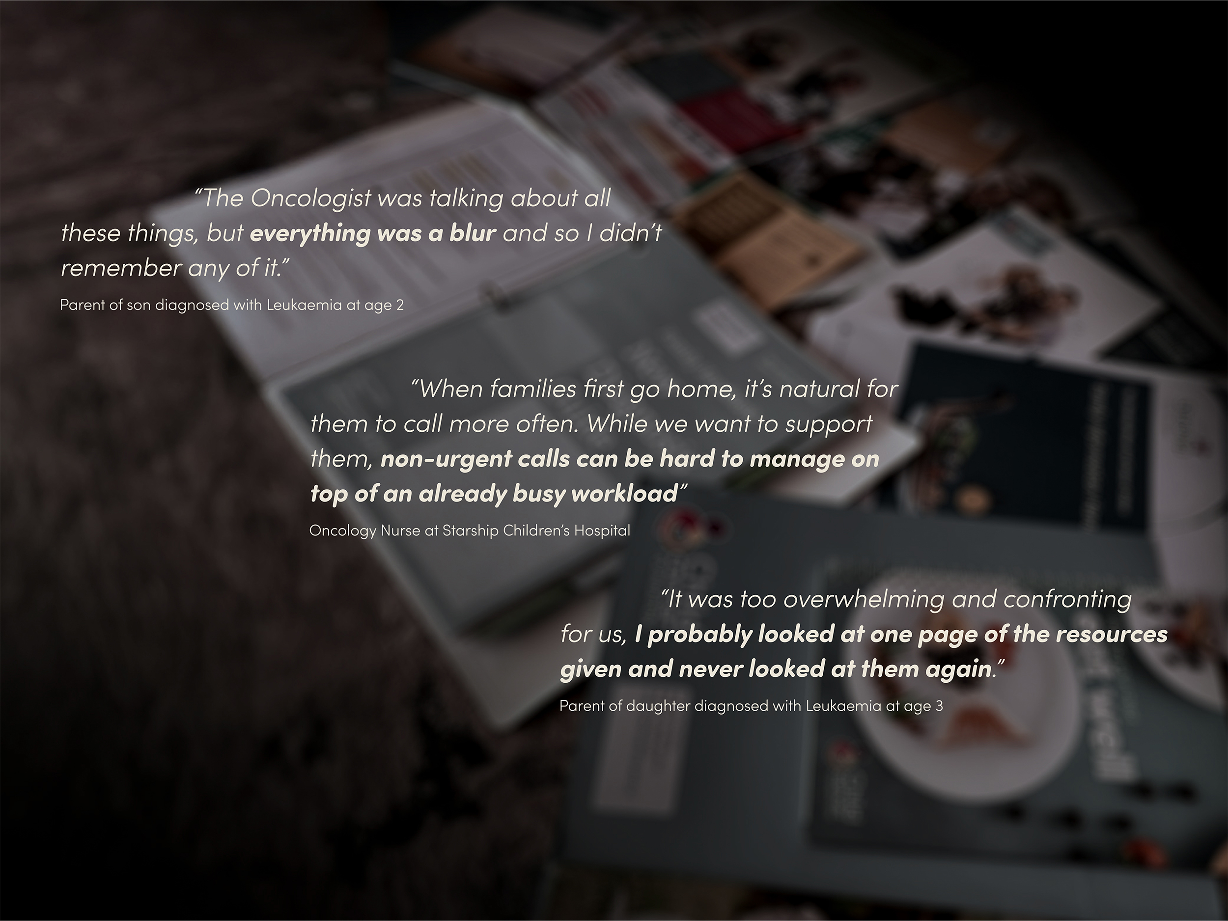 Each year, around 150 children are diagnosed with cancer in New Zealand, leaving hundreds of parents devastated as they navigate this life-changing journey. From the moment of diagnosis, parents are overwhelmed with information and resources, one of which is the new patient folder, designed to be a reliable guide. However, while the information parents desperately need is already available in this folder, it’s simply not accessible when they need it most. Its one-size-fits-all approach, covering every diagnosis and treatment type, makes it too confronting to navigate at a time when “everything feels like a blur.” Lacking the mental capacity to take it all in, parents instead turn to their medical teams for reassurance, placing extra pressure on staff already managing heavy workloads, particularly as families begin treatment at home for the first time.