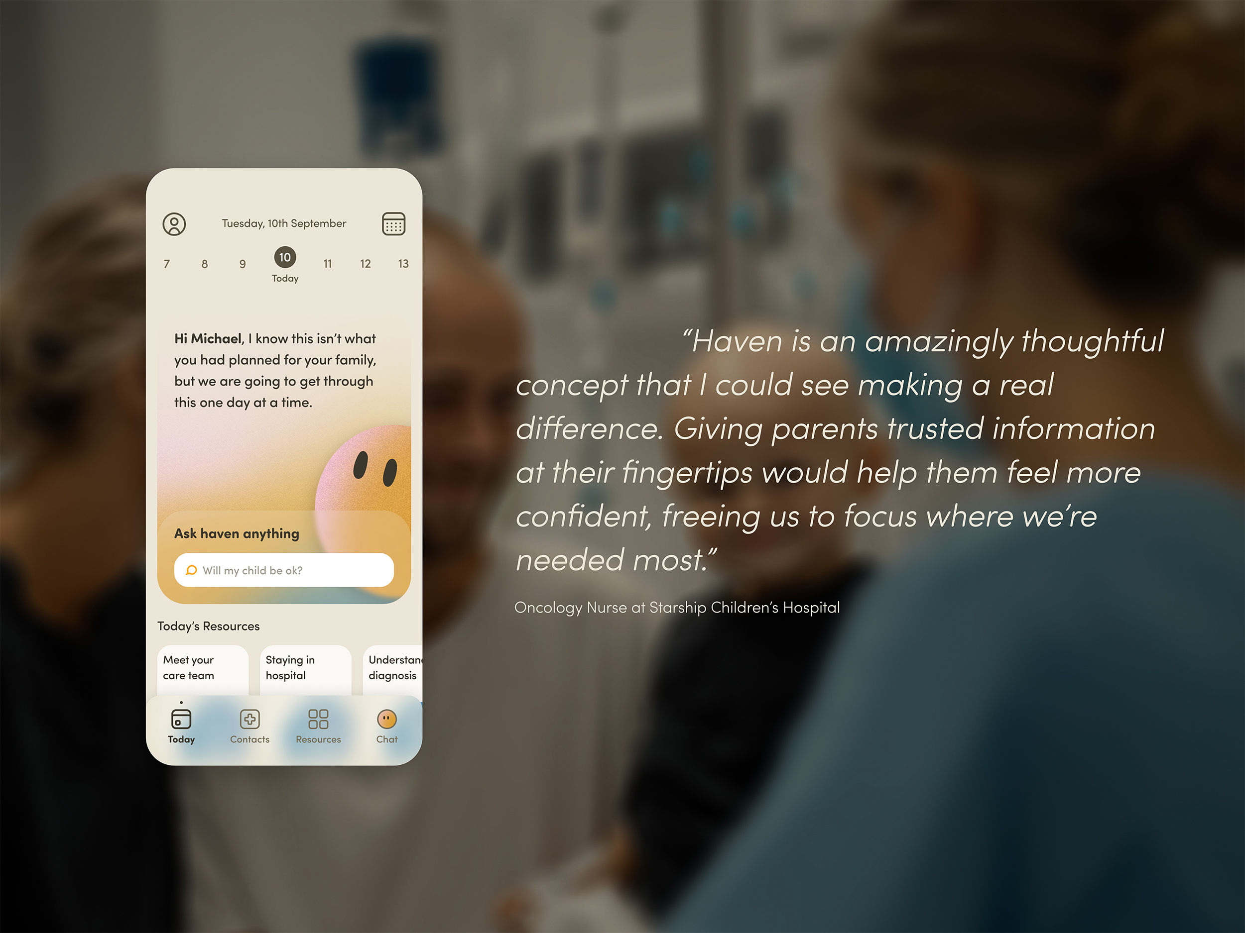 Haven is New Zealand’s first personalised companion app, designed to bring trusted, hospital-verified information to parents navigating their child’s cancer journey. Through an empathetic AI companion, parents can ask any question and receive supportive, reassuring answers whenever they need them, alongside daily medical resources tailored to where they are in their journey. Whether it’s 2 a.m. and they’re worried about their child’s temperature, or they’re feeling anxious about an upcoming procedure, Haven provides immediate, compassionate guidance that helps ease the uncertainty of the unknown.