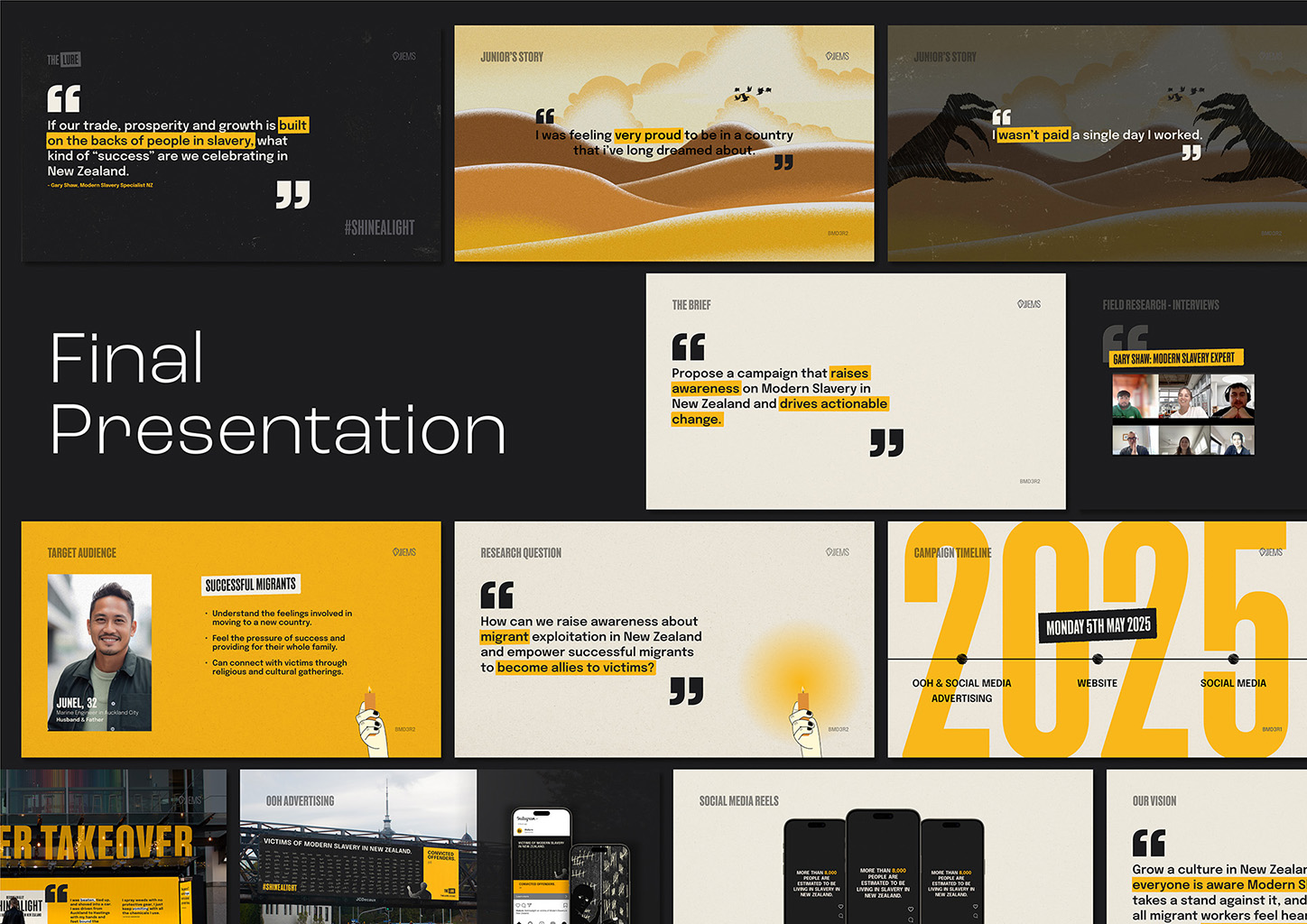 The problem is, most of our population doesn't even know this kind of exploitation exists. Our challenge was to design a campaign that would promote awareness around Modern Slavery in Aotearoa and inspire an audience to take action-taking measures to combat and challenge its existence.