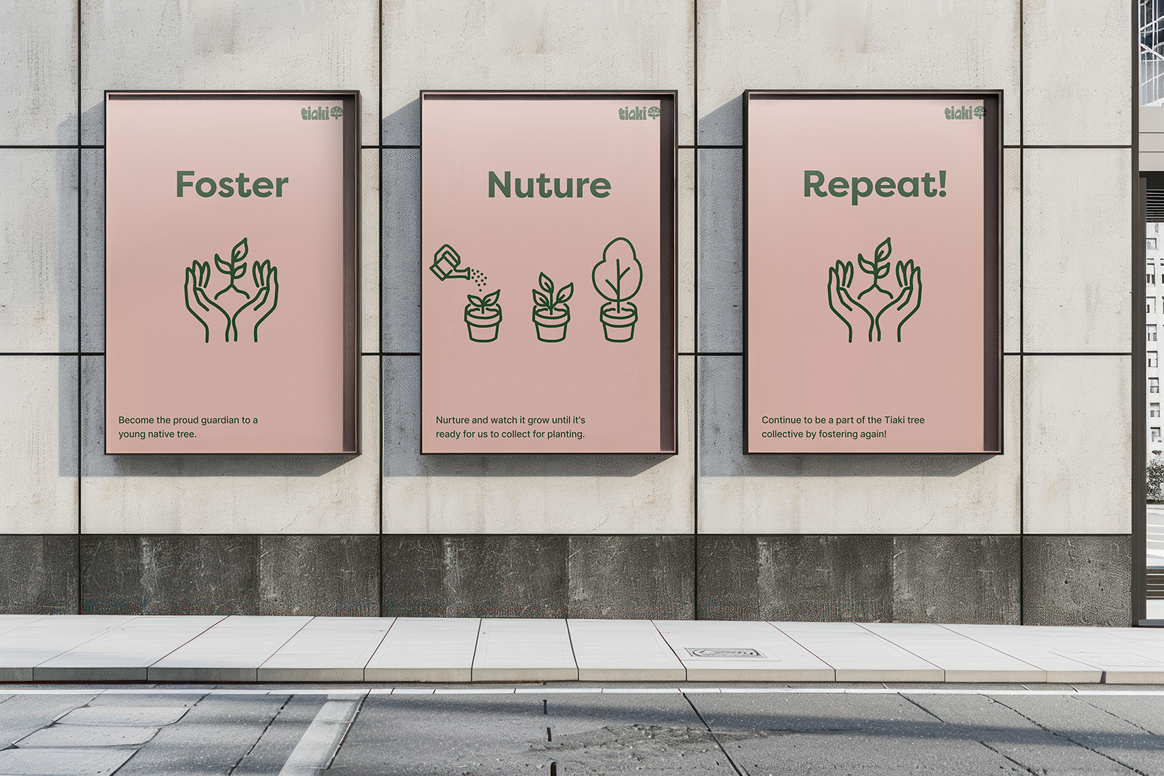The Tiaki brand strategy centers around making native tree planting accessible and appealing to urban dwellers. The name "Tiaki" means "to care for" in Māori, reflecting the nurturing aspect of fostering young trees. The brand positioning focuses on sustainability, community involvement, and the emotional connection people have with caring for living things.